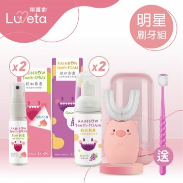 ---- 產品組合項目 ---- 組合內容物/(左至右順序) ◎兒童專用口腔噴護劑 數量:2入 容量:20ml 口味:草莓/優格多多/水蜜桃... 原價 : 3,660 現場價:NT$2,980 【Luveta】明星刷牙組 兒童專用泡沫牙膏 / 口腔噴劑 / U型電動牙刷