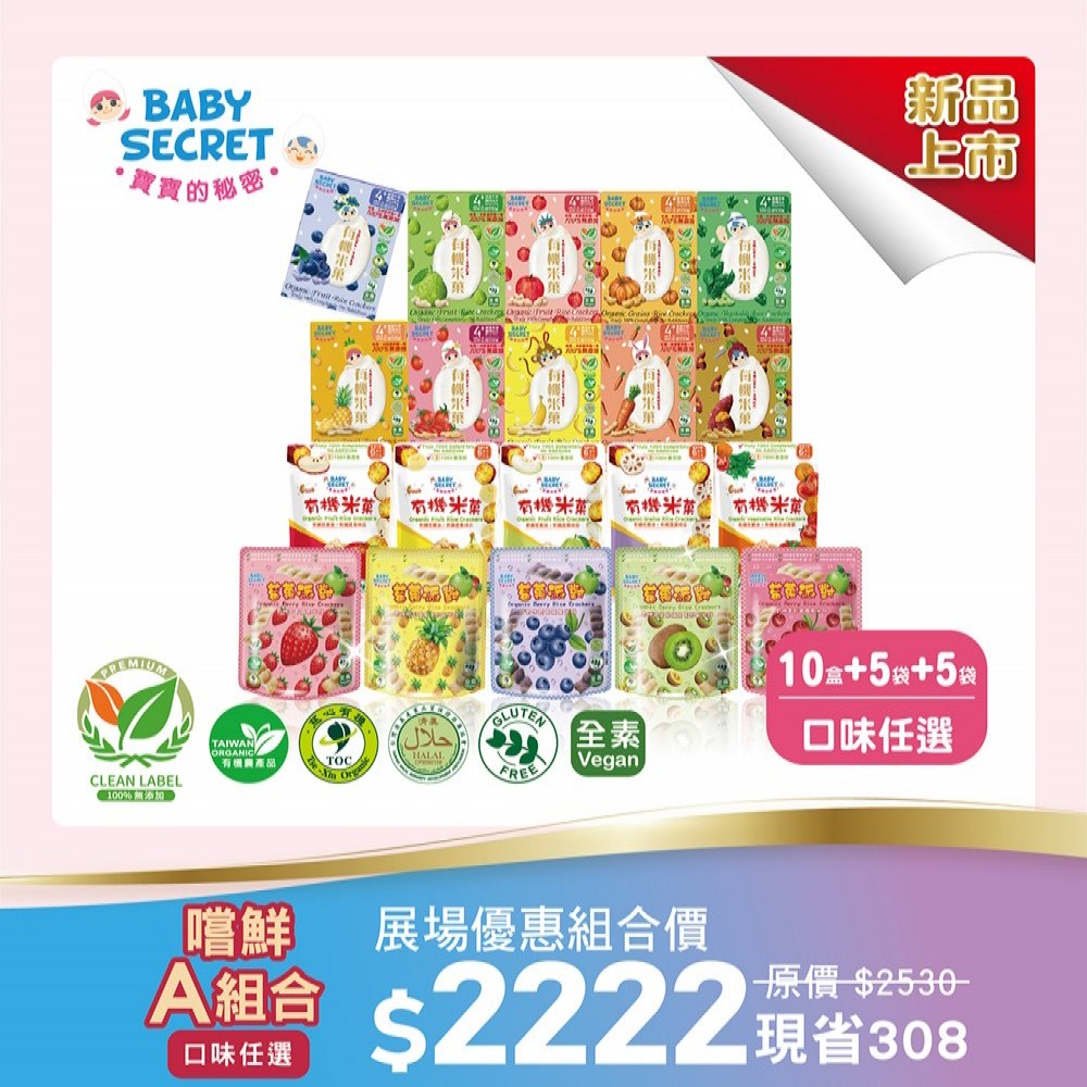 【BABY SECRET 寶寶的秘密 】有機米菓10盒(口味任選) + PLUS有機米菓5袋(口味任選) + 莓菓派對有機米餅~5袋(口味任選)